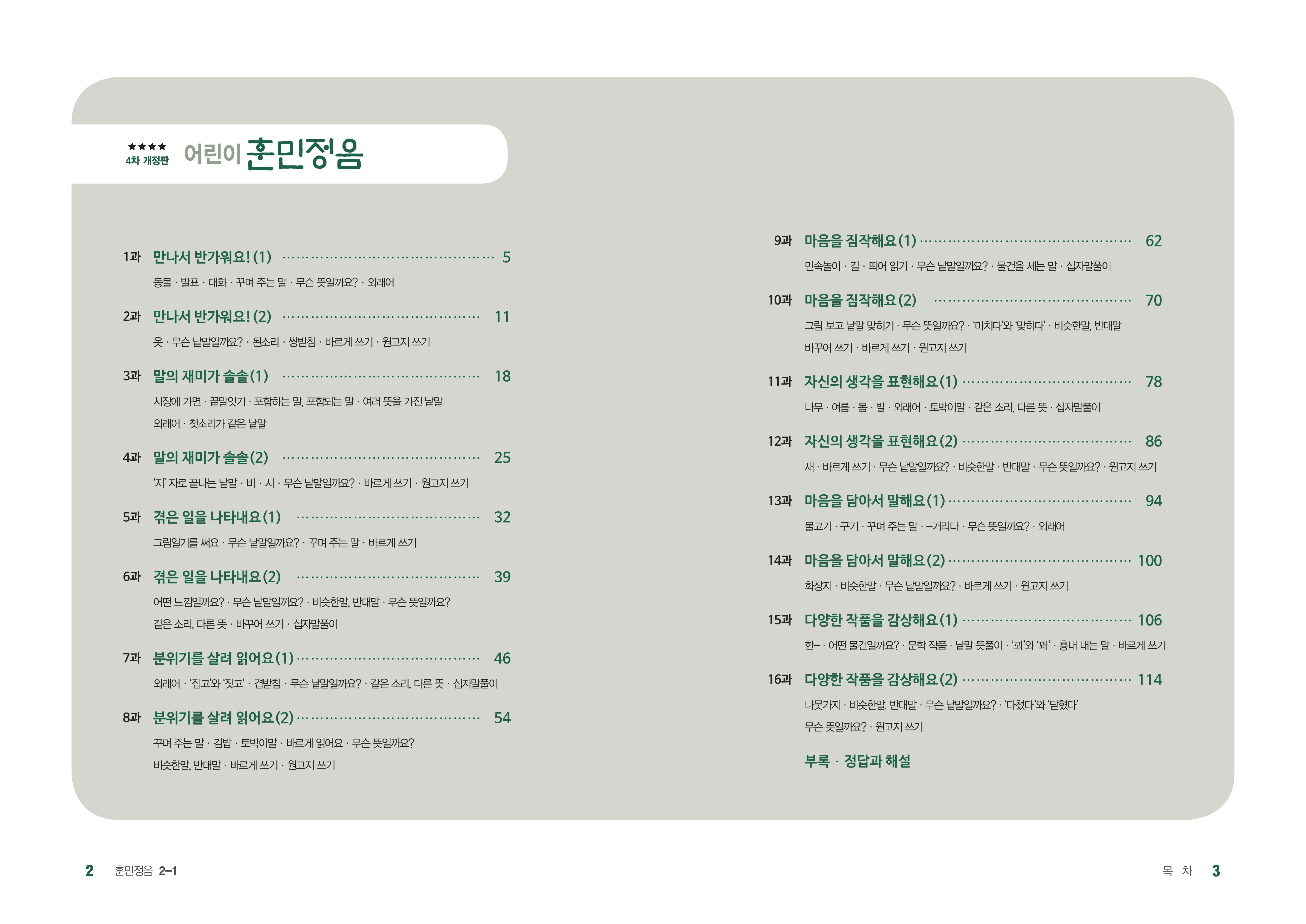 어린이 훈민정음은 초등학교 학생들의 어휘력 향상을 위해, 2002년 첫 출간 된 이래로 지금까지 교사와 학부모들로부터 좋은 평가를 받아 왔습니다. 그리고 교과서 어휘를 중심으로 편집되었기 때문에 새 교과서가 나올 때마다 개정판이 나왔으며, 4차 개정판은 2024년부터 적용되는 새 교과서 내용을 반영한 것입니다.