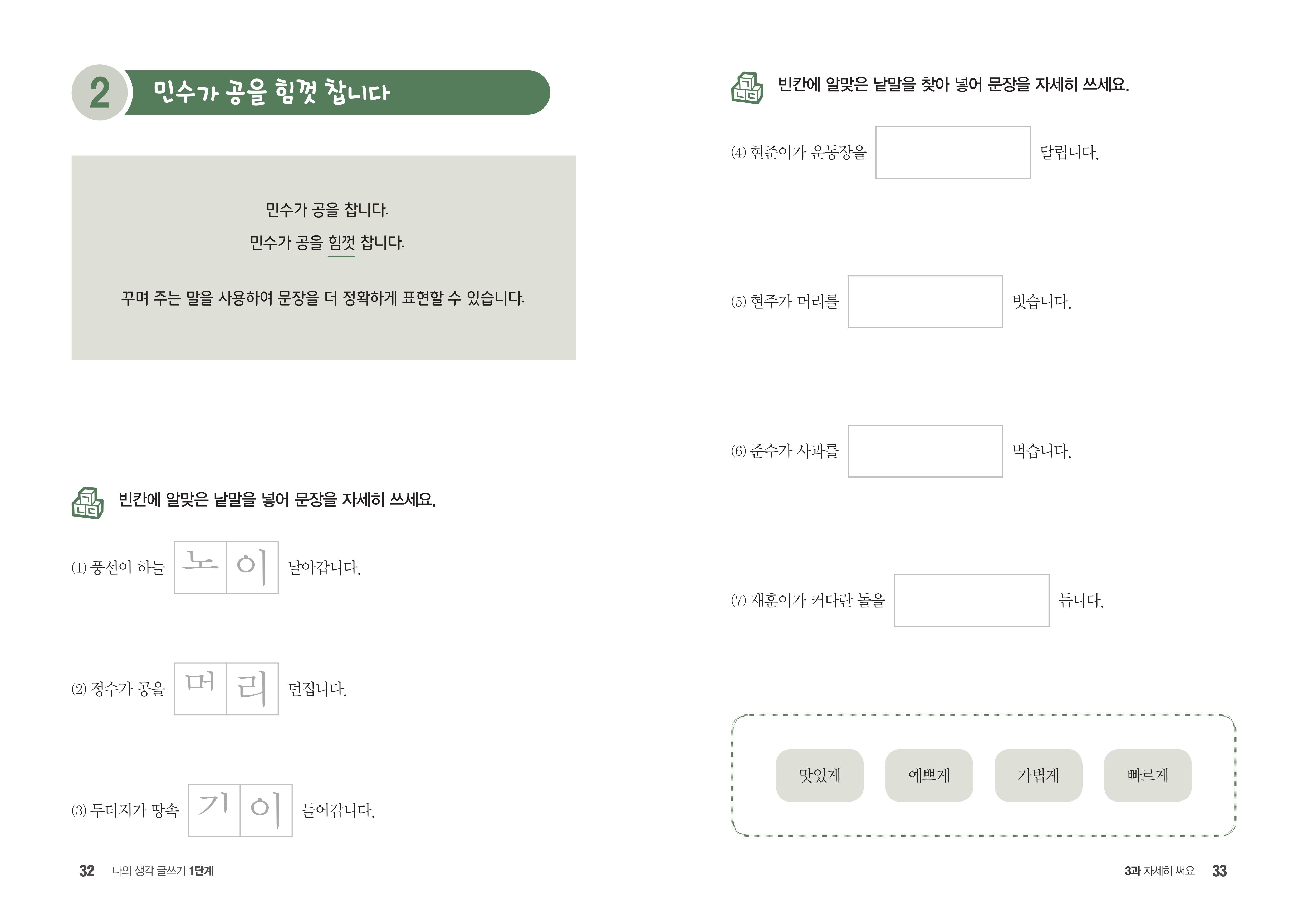 흉내 내는 말로 자세히 써요・민수가 공을 힘껏 찼습니다・민규는 오전에 책을 읽었습니다・재연이가 달콤한 사탕을 먹었습니다・종합연습